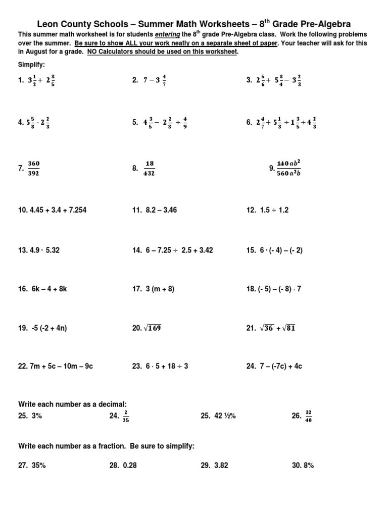 Grade 8 algebra 8th grade math worksheets. 8th Grade Math Worksheets - TheWorksheets.CoM - TheWorksheets.com Math 8th Grade. 2021 MATH DAY 8th Grade: Read and answer questions 1. Suppose there are 20 games left in the season. The Giants are in 1st place in the NL West with 85 wins. The Rockies are in 2nd place in the NL West with 82 wins. If the Giants win 40% of their remaining games, and the Rockies win 60% of their remaining games, after. Browse Printable 8th Grade Math Worksheets | Education.com In this eighth-grade math worksheet, students will learn about the properties of integer exponents and then practice applying what they've learned. 8th grade. Math. ... Practice solving one-variable, multi-step equations with this eighth-grade algebra worksheet! 8th grade. Math. Worksheet. Systems of Equations Elimination Maze. Worksheet. Grade 8 Math Worksheets - Online Math Learning We have free math worksheets suitable for Grade 8. Decimal Word Problems, Add, Subtract, Multiply, and Divide Integers, Evaluate Exponents, Fractions and Mixed Numbers, Solve Algebra Word Problems, Find sequence and nth term, Slope and Intercept of a Line, Circles, Volume, Surface Area, Ratio, Percent, Statistics, Probability Worksheets, with video lessons, examples and step-by-step solutions. 8th-Grade Math Word Problems Worksheets - ThoughtCo Divide each side of the equation by 2, which shows you that S = $1.50. Then, substitute $1.50 for S in the first equation: 5P + 3 ($1.50) = $23, yielding 5P + $4.50 = $23. You then subtract $4.50 from each side of the equation, yielding: 5P = $18.50. Divide each side of the equation by 5 to yield: P = $3.70.